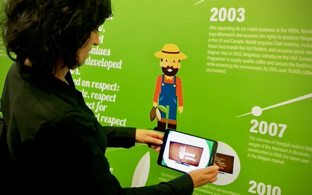 For the 150 years of Nestlé, ActiveMe has created an interactive wall in the headquarter in Bruxelles. The evolution as well as the different commercials of the brand during these 150 years is shown in augmented reality (AR), on a giant sticker with a timeline.