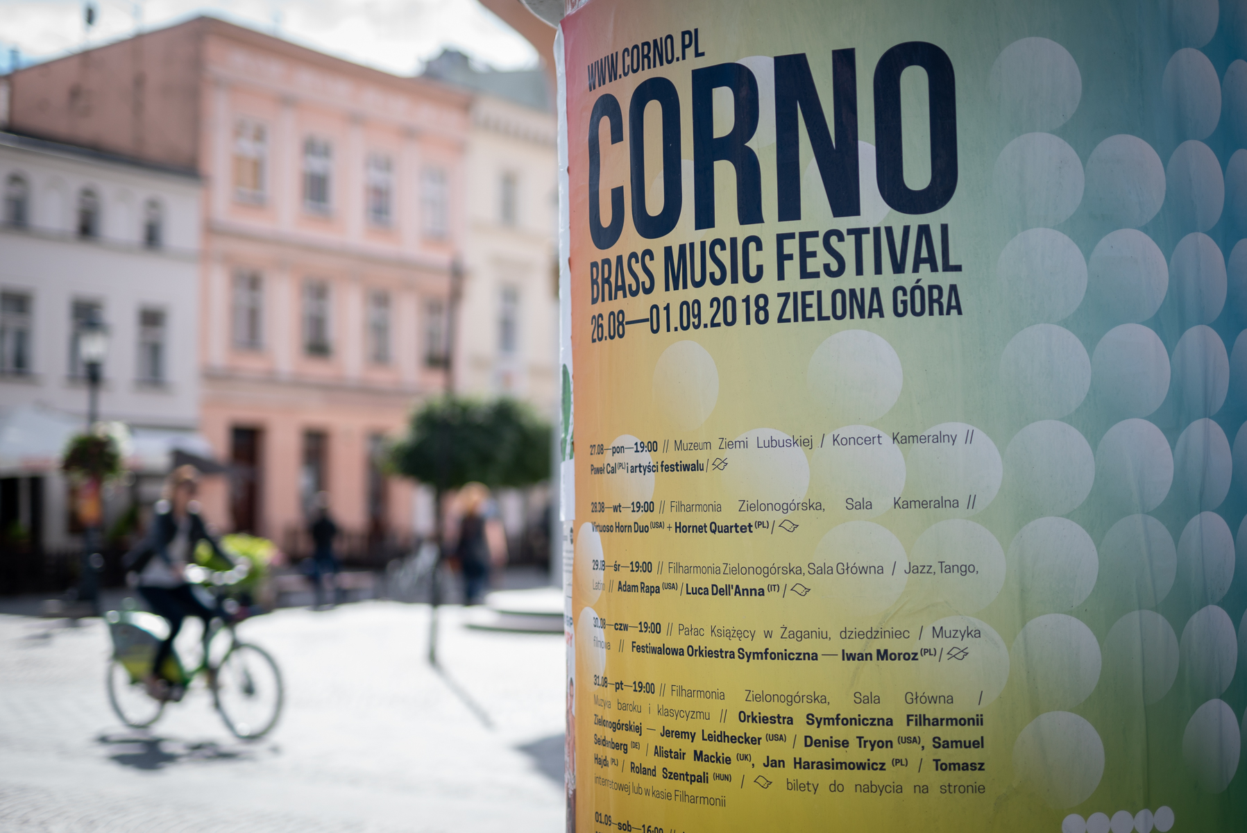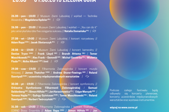 CORNO – festiwal o światowej klasie, ale bez nadęcia. Co roku w kilkaset osób spotykamy się w Zielonej Górze, aby celebrować muzykę w doskonałym wykonaniu podczas różnorodnych koncertów. Nie zamykamy muzyki tylko w salach koncertowych. Pozwalamy jej płynąć w plenerze, wybrzmieć w murach kościołów i wypełniać dźwiękami kameralne przestrzenie czy kluby rozrywkowe.