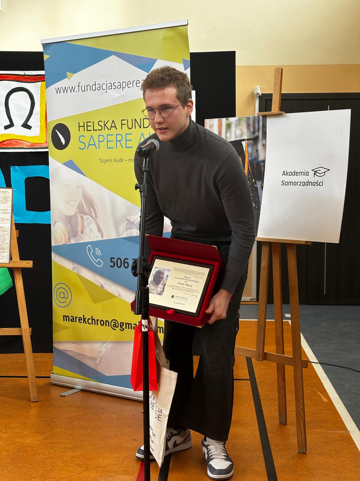 Kapituła w składzie: Henryka Krzywonos-Strycharska, Aldona Bojanowska i Marek Chroń przyznała tegoroczne wyróżnienie Pawłowi Muża – uczniowi LO w Helu, który z dumą pielęgnuje kulturę kaszubską i daje przykład, jak łączyć tradycję z nowoczesnością. ??