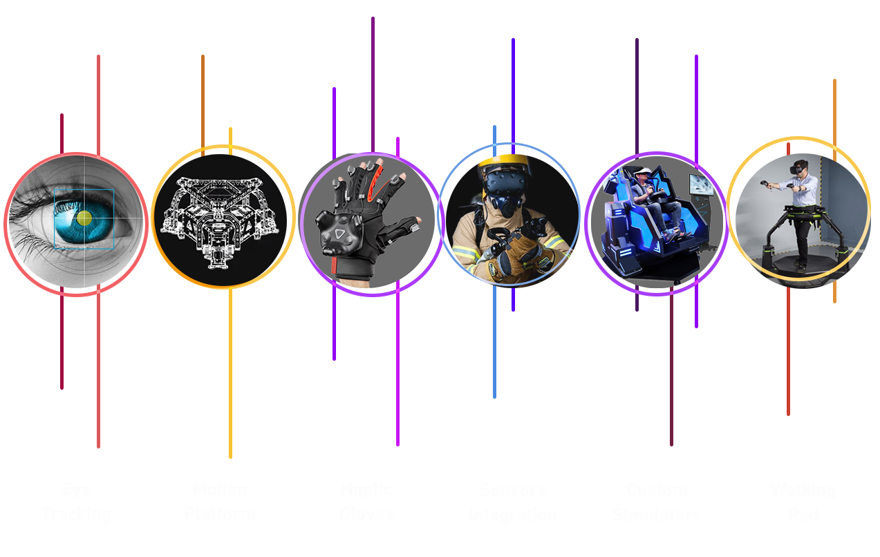 In all XR experiences, we can integrate extra add-ons to reach higher retention rate, more realistic trainings or deeper analyses such as eye tracking, motion platform, haptic gloves or vest, walking pads, custom sensors & simulators, …